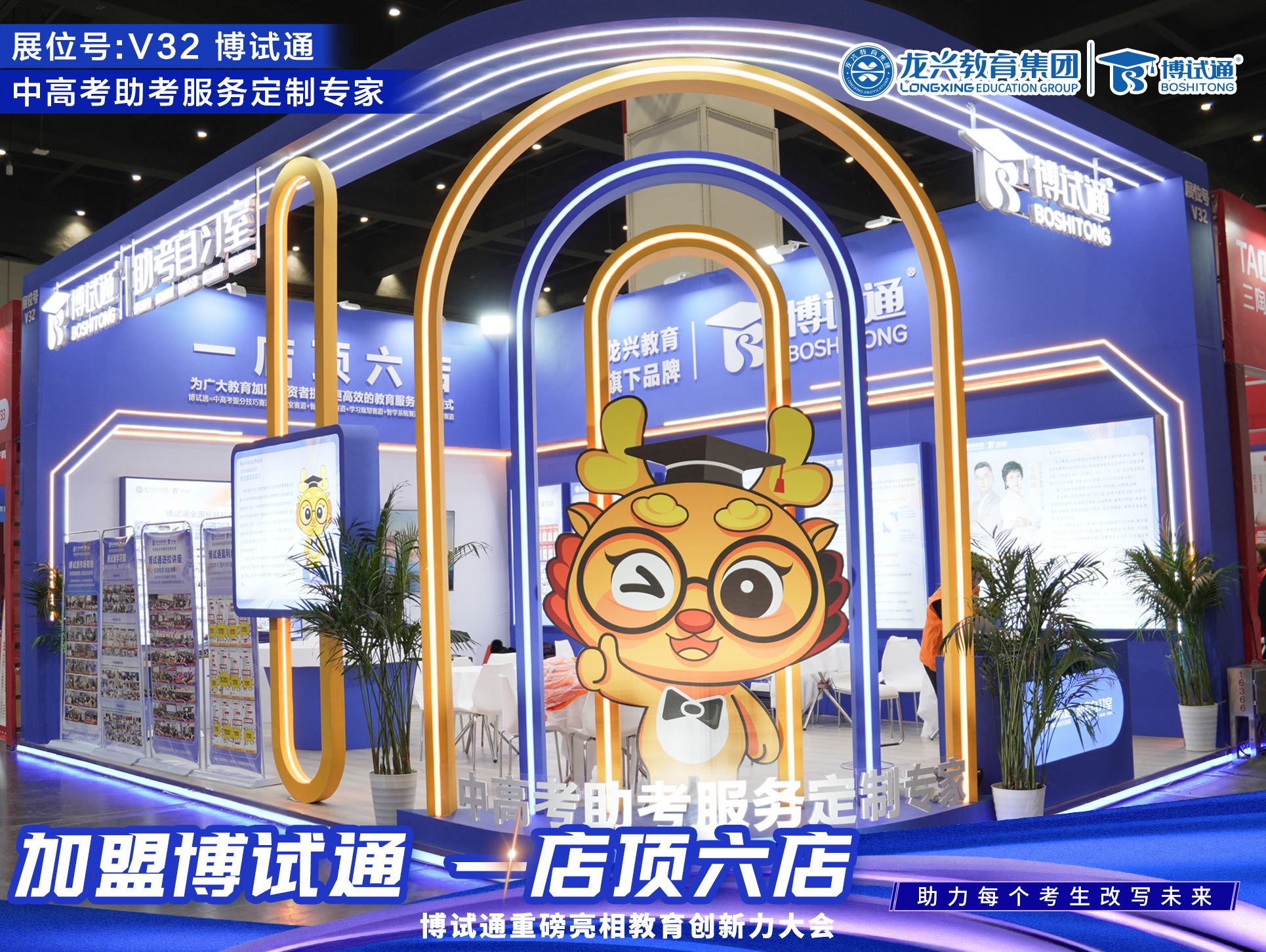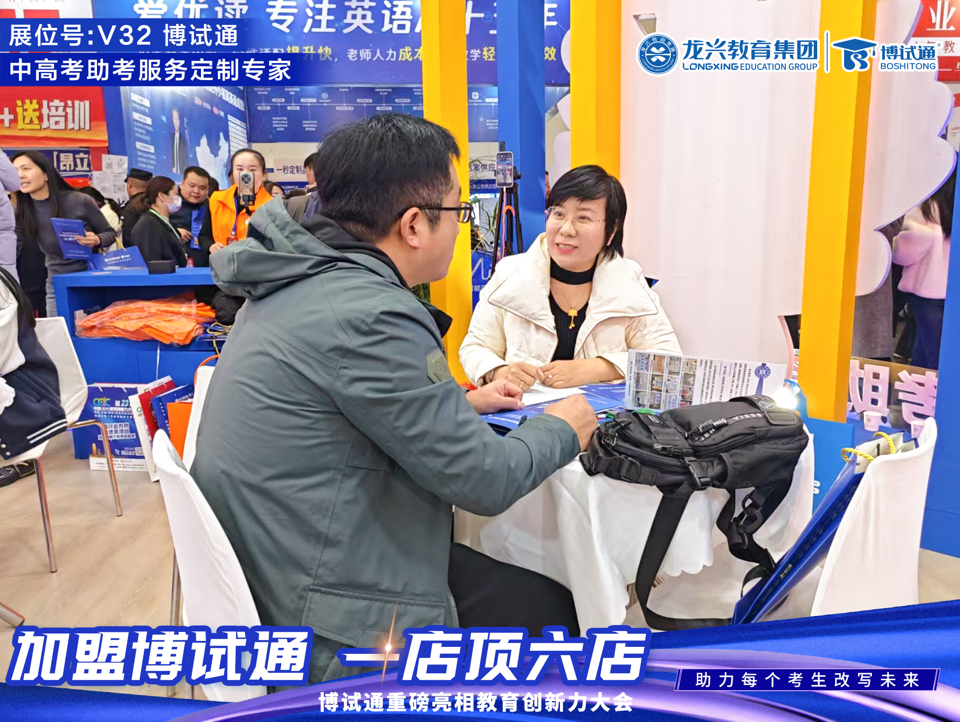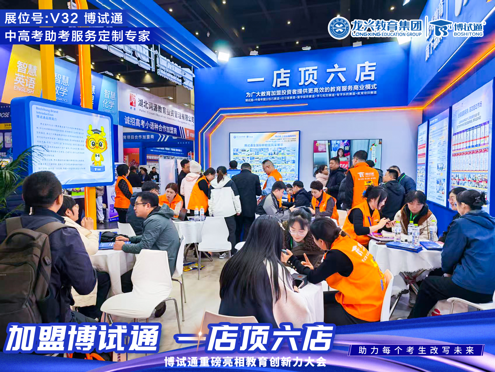 郑州,2025年11月18日 —— 今日,第23届中国(郑州)教育创新力大会暨全国教育项目加盟展在郑州国际会展中心隆重开幕。在这场行业风向标盛会之上, 龙兴教育集团旗下战略品牌“博试通”以“中高考助考服务定制专家”之姿强势登场,凭借堪称“全场第一展位”的卓越形象与强大气场,龙兴教育集团【博试通】的V32展位人气爆棚,其创新的“一店顶六店”盈利模型与保姆式陪跑赋能模式引发强烈关注,洽谈区人头攒动,成为本次大会现象级的焦点,以闪耀全场级表现重新定义行业新纪元,正式开启了教培行业转型赋能的新蓝海。