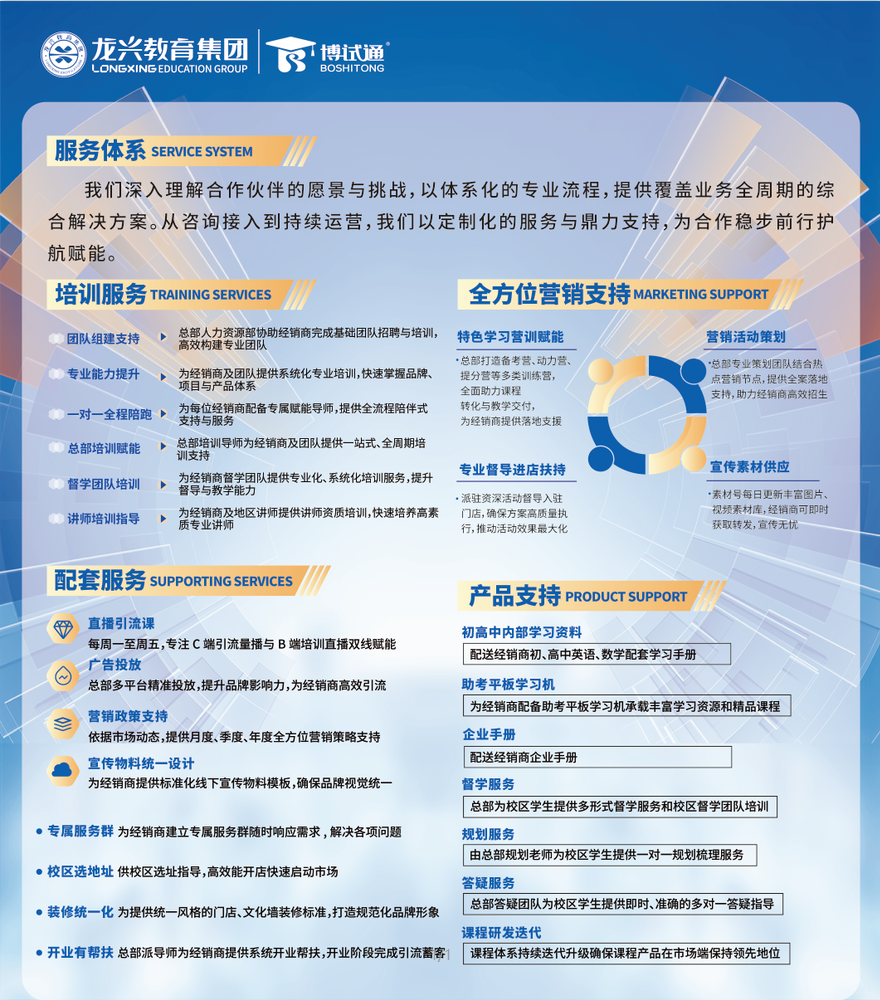 立足行业领导者地位,博试通依托龙兴教育集团雄厚实力与全国超1000家校区的成功运营经验,构建了一套覆盖加盟全周期的“保姆+管家”式陪跑体系,真正实现从选址筹建、团队搭建到运营落地的全程托底。总部不仅提供专业的区域评估、标准化装修设计与开店支持,还通过系统化培训与驻店帮扶,协助加盟商高效完成团队培训、招生策划与管理系统建设,大幅降低创业风险,确保校区快速步入正轨。
