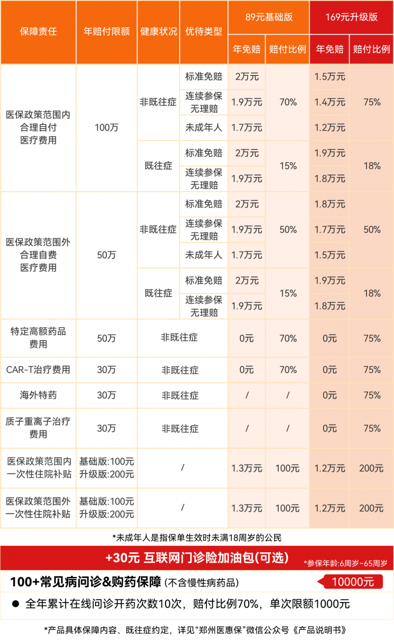 2026年度“郑州医惠保”产品依旧提供基础版与升级版,在原有基础之上,保障全面优化,理赔门槛再降,新增一次性住院补贴,可选互联网门诊险加油包,市民可按需选择。